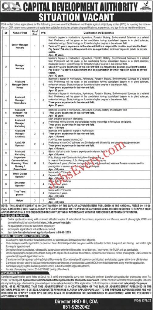 The CDA Jobs advertisement was published in the Express Newspaper on 20 September 2025 (Saturday). The last date to apply for CDA Jobs is 09 October 2025 (Thursday).