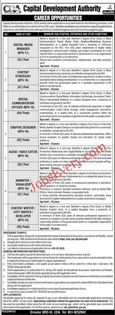 The Capital Development Authority (CDA) Islamabad has officially announced the latest CDA Jobs 2025, providing excellent career opportunities for skilled and creative professionals in the fields of communication, media, and content development. These vacancies were published in the Express Newspaper on 21 September 2025 (Sunday), and the last date to apply online is 09 October 2025 (Thursday).