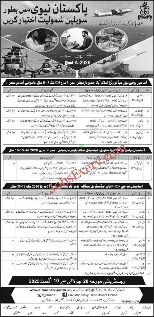 Jobs Every Provide the best opportunity for fresh and experienced graduates to get Navy Civilian job in Govt Pak Navy. Pakistan Navy Civilian jobs offer opportunities for skilled individuals to serve the nation in various technical and administrative roles. These positions are open to both men and women and include roles in engineering, medical, IT, clerical, and support staff. Civilians play a vital role in the smooth operation of naval bases and units. Recruitment is conducted regularly with merit-based selection. It’s a respected career path with job security, benefits, and a chance to contribute to national defense.