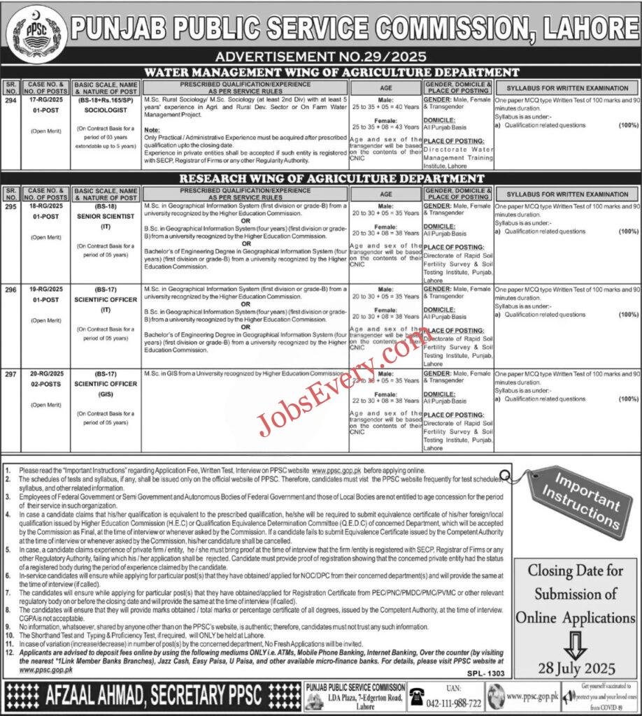 PPSC jobs ad 29/2025 opens four contract seats at the Agriculture Research Institute in Faisalabad a BS-18 Sociologist (MSc Rural Sociology plus 5 years’ field work), a BS-18 Senior Scientist GIS, and three BS-17 Scientific Officers GIS (MSc/BSc GIS or engineering, second-division minimum) all on a five-year contract and open to male, female, and transgender candidates holding Punjab domicile. Selection hinges on a 100-mark, 90-minute MCQ paper, so apply online at ppsc.gop.pk and upload CNIC-matched credentials by July 28 2025; late or incomplete files are dropped, but passing the written test lands you inside provincial projects on tech-driven soil surveys, crop mapping, and sustainable irrigation policy.