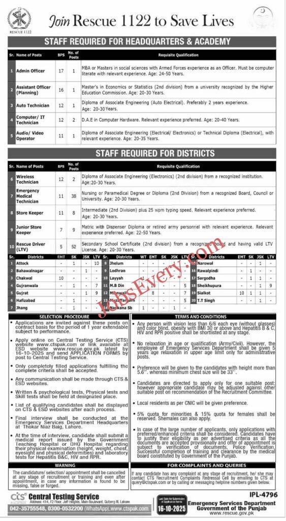 Rescue 1122 Jobs 2025 are announced for the following posts:
