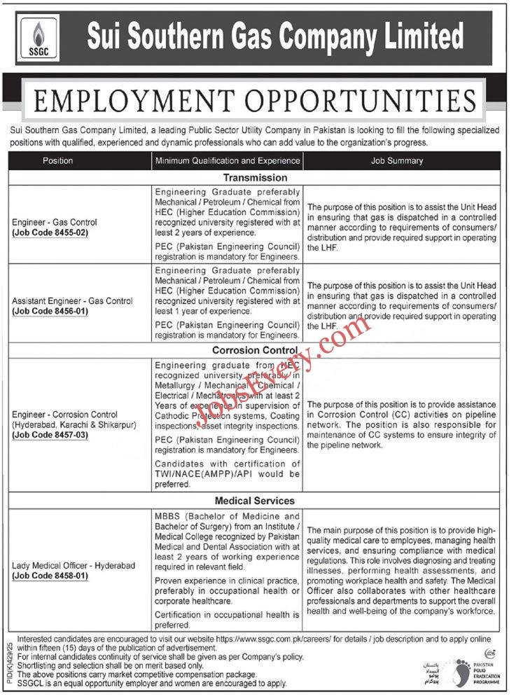 Jobsevery Provide the best opportunity for fresh and experienced graduates to get jobSSGC Jobs in Govt. SSGC Jobs 2025 – Sui Southern Gas Company Limited has announced exciting career opportunities for Assistant Engineer and various other positions. Eligible candidates are encouraged to apply and become part of a leading energy sector organization. SSGC Jobs 2025 offer a promising future for professionals in engineering and technical fields. Don’t miss your chance to join Sui Southern Gas Company Limited and contribute to national progress.